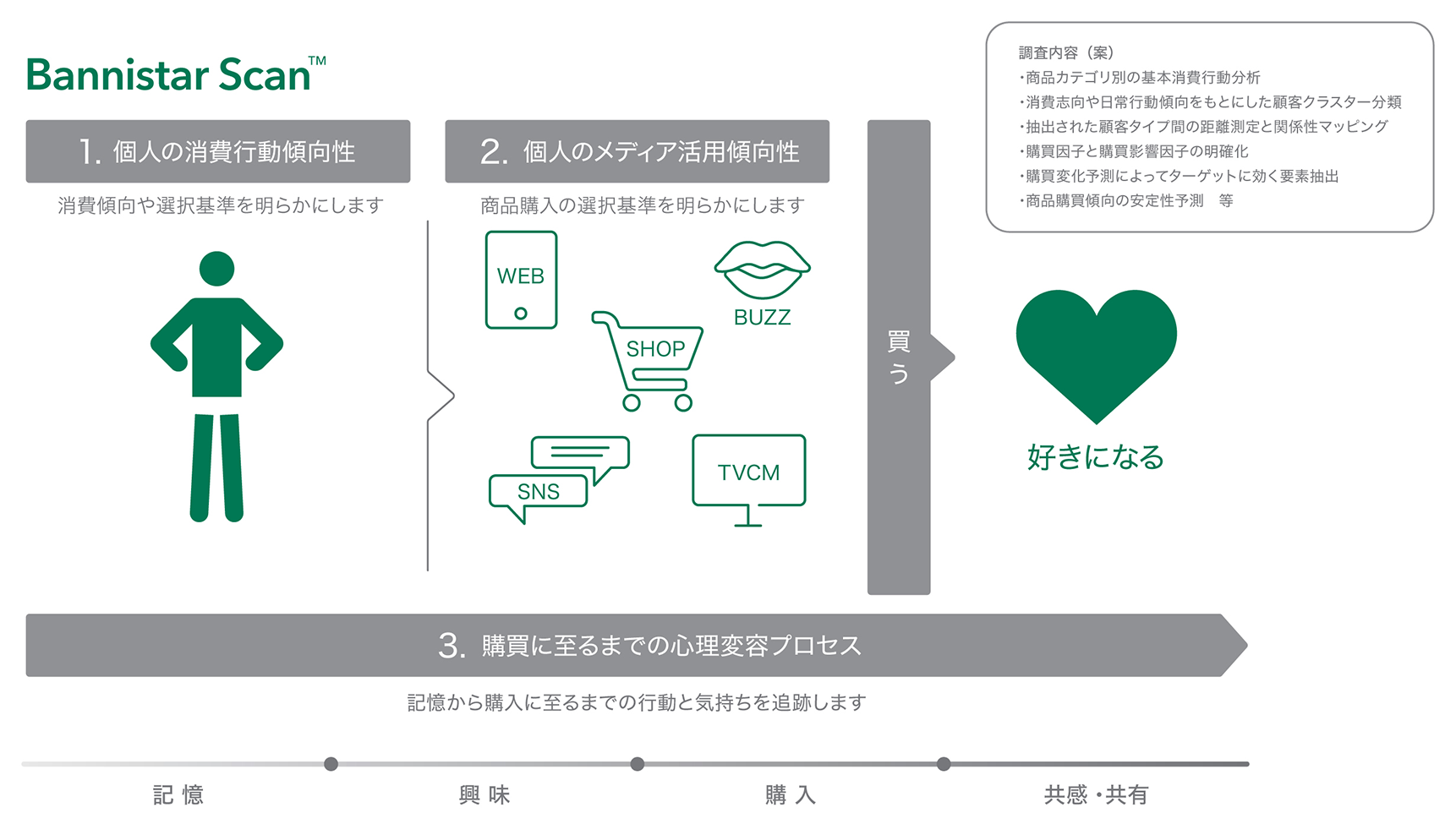 バニスターは、パーソナリティ測定や行動心理学等の知見を応用し「バニスター・スキャン™」を開発しました。これは、消費行動の傾向性を観測・分析し、人の将来的な購買行動を予測するもの。量的/質的データの掛け合わせはもちろん、顧客タイプを抽出するために、消費者心理や購買因子、購買影響因子等の多変量解析を徹底的に行います。特徴は、群ではなく、個の消費活動の総和によって人の志向性を導き出すこと。デザイン視点からも因子を作成し、現状把握はもちろん、将来の購買行動の変化予測を行うことができます。