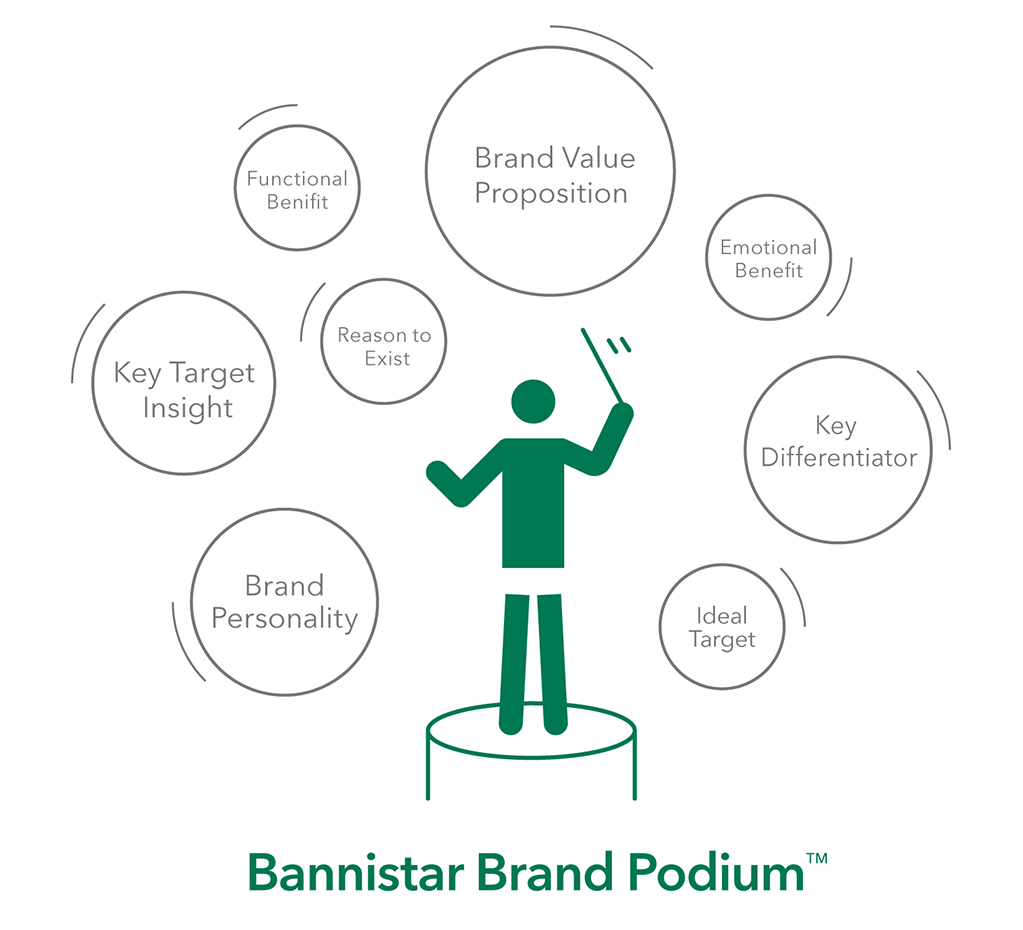 ブランドを理論的・情緒的に様々な面から定義し、差別性と独自性を確立する上で不可欠な提供価値を言語化するためのプラットフォームです。バニスター・ブランドポディウム™は、ブランドとお客様の関係性や、目指す将来像、ビジョンや戦略を明らかにする助けになります。バニスター・ブランドポディウム™は、お客様の欲求や機能的便益、情緒的便益、独自性、ブランドパーソナリティー、提供価値など8つのコンポーネンツで構成されており、あたかもオーケストラの指揮台のように、ブランドの多様な要素すべてを統合しつつ方向付けて、最高のポテンシャルを引き出すのです。