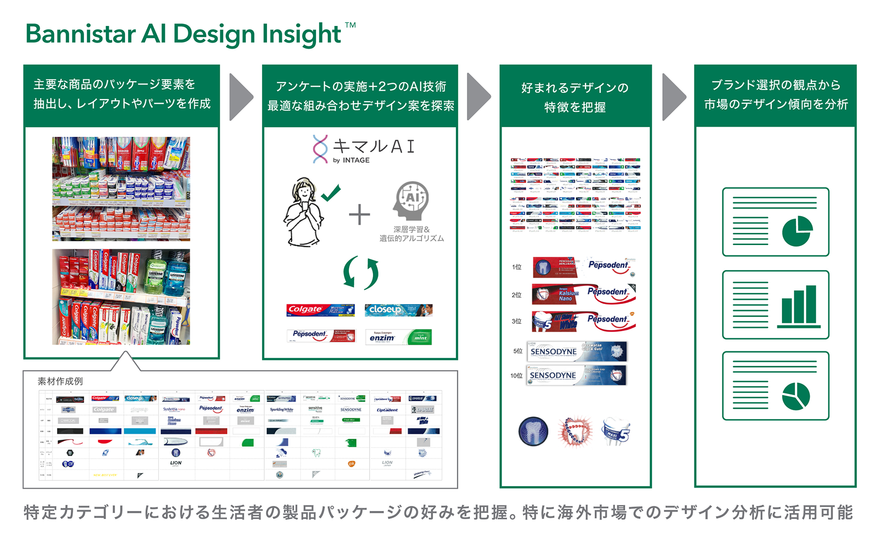 「キマルAI」は、生活者のアンケートによる評価とAIによる深層学習・最適化技術を用いて、デザイン素材の組み合わせ数千~数百万通りの中から、生活者に最も好まれるデザインを見つけ出すインテージ社のサービスです。インテージ社と連携し、「キマルAI」を用いて、市場での商品デザインの傾向性を把握するサービスを行うのが「バニスター・AIデザインインサイト™」です。既存市場における主要商品のデザインの傾向や生活者の嗜好を読み解くことにより、新規のブランド開発・商品パッケージ開発に役立てることができます。特に、新規で参入する国や地域において、現地で好まれるデザインの傾向を把握する際に有効です。本サービスを既存市場のデザイン選好傾向の把握に活用するためには、素材として使用する特定カテゴリの主要商品パッケージについて、重要なデザイン要素を考察し、的確に抽出することが大切です。バニスターでは、ブランド戦略の専門的な知見を交えて既存市場に存在するパッケージデザインのデザイン価値要素を抽出し、「バニスター・AIデザインインサイト™」により得られたパッケージデザインの嗜好性を、ブランド戦略の視点から考察します。さらにブランド戦略立案のための支援やパッケージデザイン制作までサポートします。