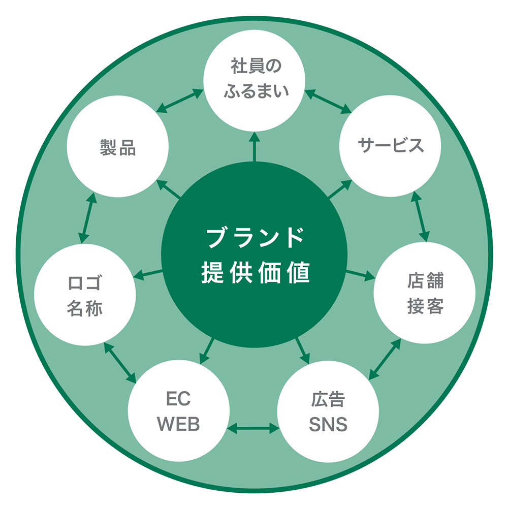 ブランディングデザインとは、ブランド提供価値を起点に、すべての接点において一貫性をもってブランド価値を高めていくデザイン活動のことです。