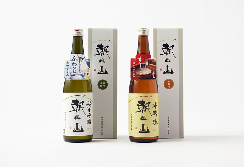 バニスターは、朝日酒造の「朝日山 純米吟醸」「朝日山 本醸造」「朝日山 純米にごり」「朝日山 純米大吟醸 越淡麗」のパッケージラベルデザイン、化粧箱デザイン、首かけ型POPデザイン・キャッチコピー開発を行いました。