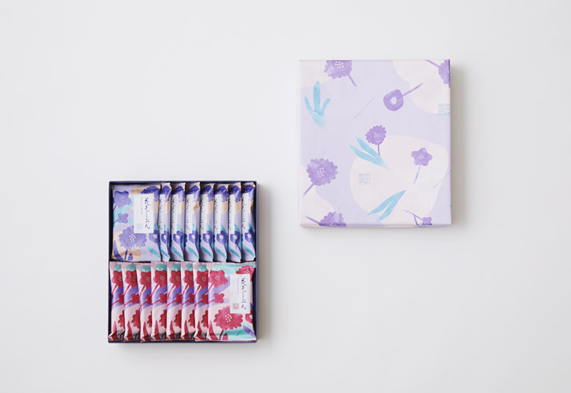 これまで中央軒煎餅ブランドの商品共通で使用していた包装紙も、パッケージと連動した花色しおん専用の包装を作成し、量販店でも存在感を示すことができるようにしました。おかきという懐かしくも安心するようなお菓子の中で、「花色しおん」は新鮮な風を吹かせる存在になるはずです。