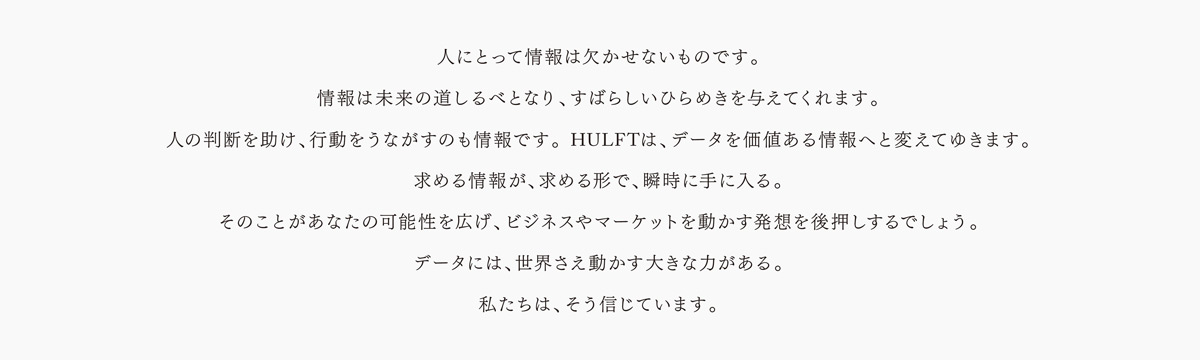 「Move knowledge. Move markets.」は、有用な知を生み出すデータを動かすことで、ビジネスや社会を動かしていくブランドであることを表現しています。“Move”にはまた“動かす”の他に、“感動させる”という意味があり、「HULFT」は社会やその先の人々も感動させるブランドでありたい、という思いも込めました。