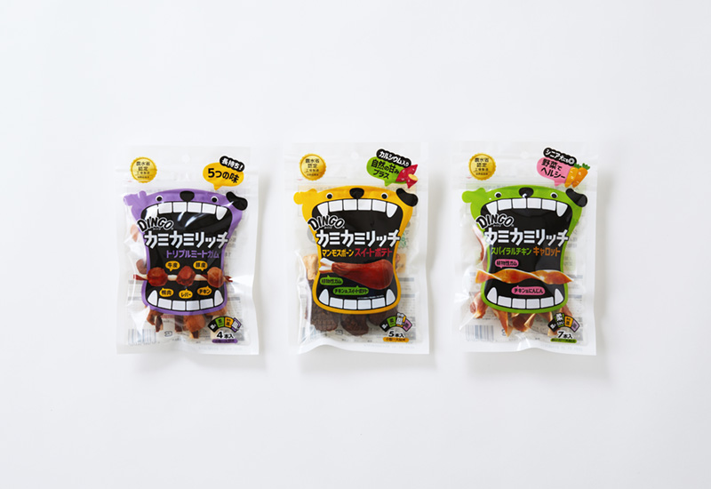新製品では「DINGO」ブランドに加え、「カミカミリッチ」というサブブランドを付けて直感的に商品理解を促し、アイテム名を日本語化した上で、さらに図解によりそれぞれの商品特徴をわかりやすく伝えることにしました。